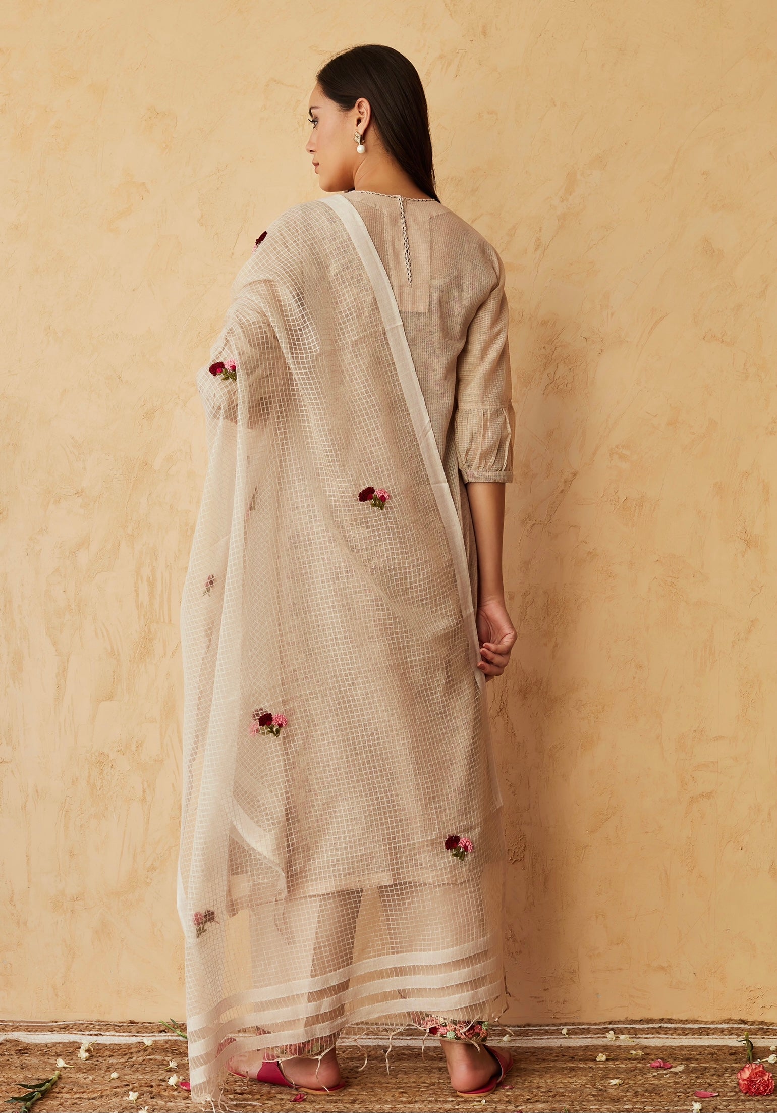 Crisp beige kurta set with hand appliqué and French knot embroidered yoke. The pants come in a tulip cut with an embroidered border. The dupatta is Chanderi in a check weave and hand embroidered bootis.