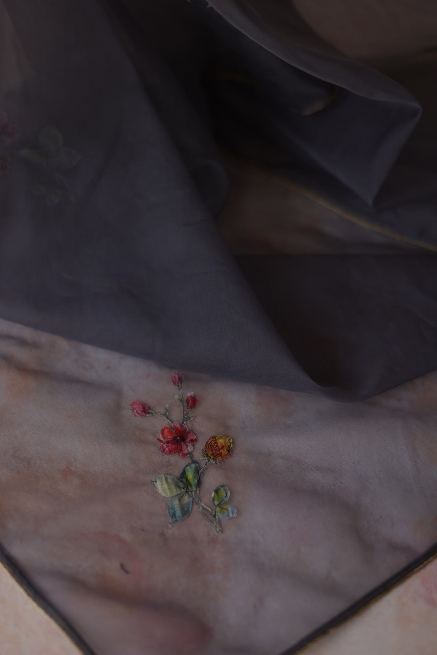 Chanderi kurta set with a zari chanderi neck with similar sleeves finished off with dainty beads and floral embroidered motifs all over the kurta with sequins and zari. The dupatta is organza with hand embroidered flowers and the pants feature similar appliqué work with an organza trim.