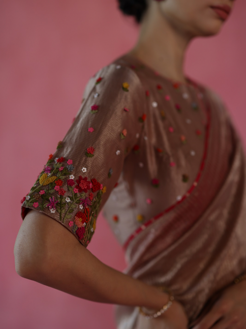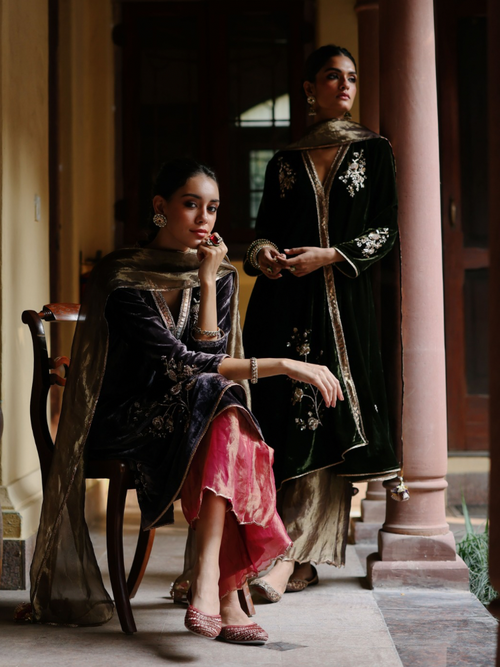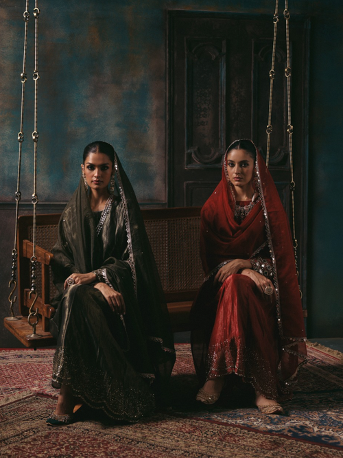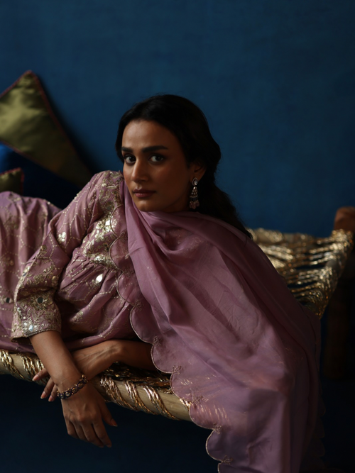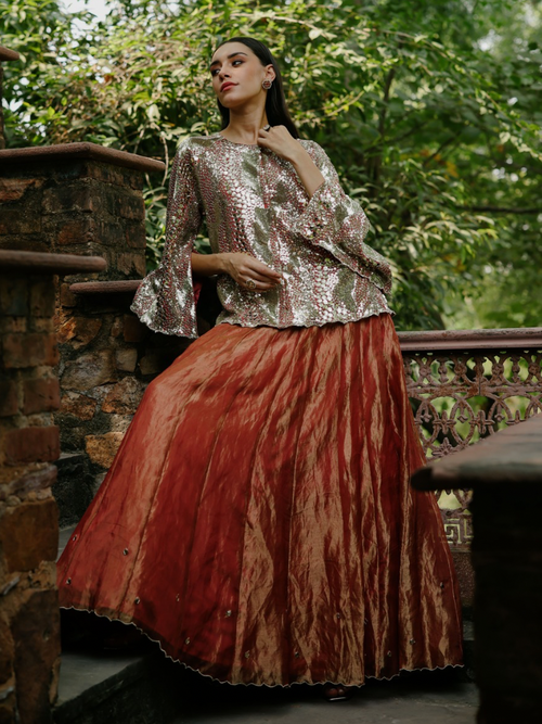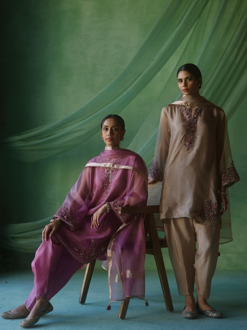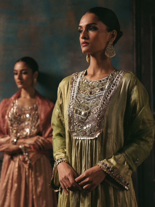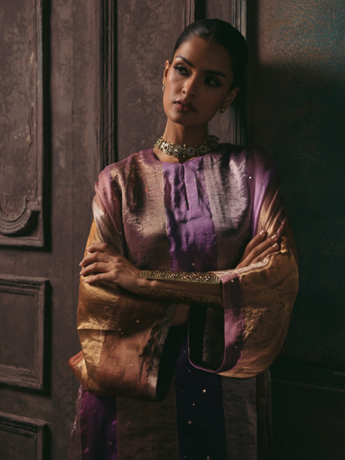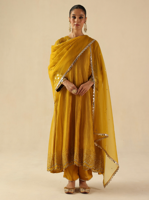 The A-line kurta set is an exquisite and elegant ensemble, perfect for your festive wear. The outfit features a beautifully designed kurta in zari silk fabric with hand-embroidered sleeves, adding opulence to the attire. Paired with the kurta are satin pants and an organza dupatta adorned with copper and gold trimmings