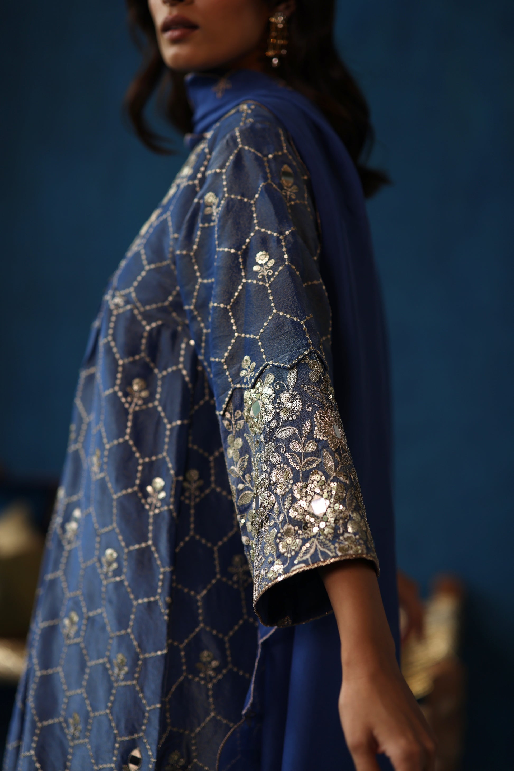 Zari silk kurta with intricate silk tissue sequin work on the neck and sleeves, complemented by delicate sequin details all over the kurta and dainty pleats on the front. Paired with satin pants and an organza dupatta adorned with scalloping and delicate zari bootie work.