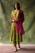 A crushed silk A-line kurta in ombre jewel tones with silk pants. The yoke features hand embroidered floral bootis with gota and nakshi accents. Accompanied with a silk Kota dupatta for an additional pop of colour.